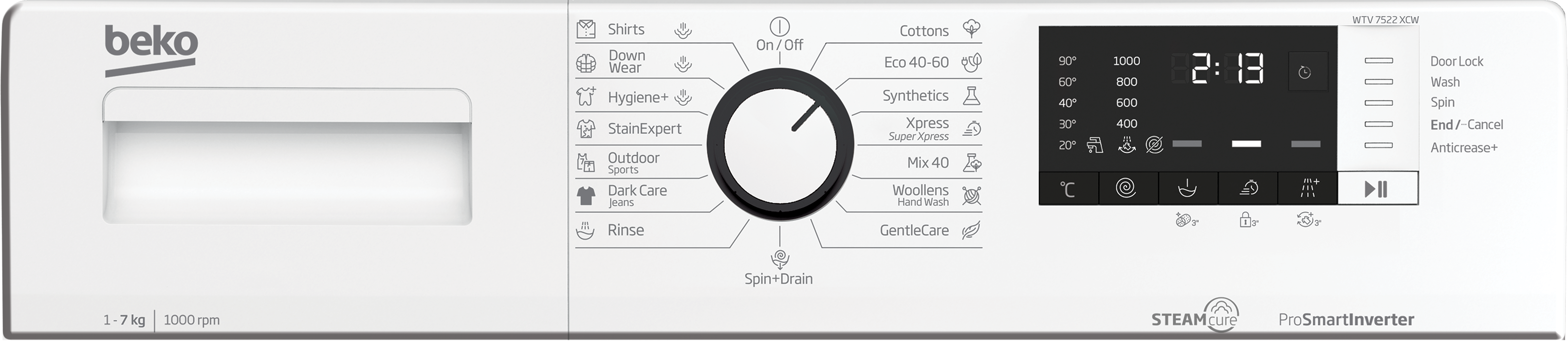 Kapacitet pranja veša 7 kg Klasa energetske efikasnosti D Maksimalna brzina centrifuge 1000 rpm Nivo buke tokom pranja 54 dBA Nivo buke tokom centrifuge 72 dBA ProSmart™ Inverter Motor Yes Visina 84.5 cm Širina 60 cm Dubina 49 cm Tehnologija pare SteamCure® Vrsta displeja Digitalni displej Boja Bela Vrsta konstrukcije Samostojeći Programi Broj programa 15 Program 1 Program za pamuk Program 2 Eco 40-60 Program 3 Program za sintetiku Program 4 Dnevni ekspres/ekspres super kratak program 14 min Program 5 Program za mešani veš Program 6 Program za vunu/ručno pranje Program 7 GentleCare™ program Program 8 Program za centrifugu i ceđenje Program 9 Program za ispiranje Program 10 Program za tamni veš/farmerke Program 11 Program za zimsku/sportsku odeću Program 12 Program StainExpert™ Program 13 Higijenski+ program sa parom Program 14 Program za jakne sa parom Program 15 Program za košulje sa parom Funkcije Funkcija 1 Pretpranje Funkcija 2 Fast+™ Funkcija 3 Dodatno ispiranje Pod-funkcija 1 Program za čišćenje bubnja parom Pod-funkcija 3 AntiCrease+® Tehnologije ProSmart™ Inverter Motor Yes Tehnologija pare SteamCure® OptiSense® Dizajn AquaWave® XL vrata Vrsta displeja Digitalni displej Boja Bela Materijal bubnja Nerđajući čelik Performanse i potrošnja Kapacitet pranja veša 7 kg Klasa energetske efikasnosti D Maksimalna brzina centrifuge 1000 rpm Nivo buke tokom pranja 54 dBA Nivo buke tokom centrifuge 72 dBA Godišnja potrošnja električne energije 173 kWh Godišnja potrošnja vode (L/godišnje) 9679 L Voltage 230 V Frekvencija 50 Hz Water Consumption 40 L Energy Consumption 69 kWh Spinning Noise Class A Dimenzije i težina Visina 84.5 cm Širina 60 cm Dubina 49 cm Težina 59 kg Visina ambalaže 88 cm Širina ambalaže 65 cm Dubina ambalaže 51.5 cm Težina upakovanog uređaja 60 kg Bezbednost Dečija sigurnosna zaštita Zaštita od prelivanja Kontrola neravnomerno raspoređenog veša Automatsko prilagođavanje količine vode
